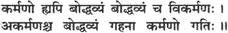 The intricacies of action are very hard to understand. Therefore one should know properly what action is, what forbidden action is, and what inaction is.