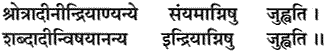 Some of them sacrifice the hearing process and the senses in the fire of the controlled mind, and others sacrifice the objects of the senses, such as sound, in the fire of sacrifice.