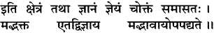 Thus the field of activities [the body], knowledge and the knowable have been summarily described by Me. Only My devotees can understand this thoroughly and thus attain to My nature.