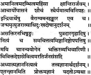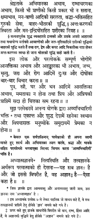As for the knowledge outlined here, the items may be analyzed as follows: Humility means that one should not be anxious to have the satisfaction of being honored by others. The material conception of life makes us very eager to receive honor from others, but from the point of view of a man in perfect knowledge–who knows that he is not this body–anything, honor or dishonor, pertaining to this body is useless. One should not be hankering after this material deception. People are very anxious to be famous for their religion, and consequently sometimes it is found that without understanding the principles of religion, one enters into some group, which is not actually following religious principles, and then wants to advertise himself as a religious mentor. As for actual advancement in spiritual science, one should have a test to see how far he is progressing. He can judge by these items.