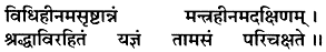 And that sacrifice performed in defiance of scriptural injunctions, in which no spiritual food is distributed, no hymns are chanted and no remunerations are made to the priests, and which is faithless–that sacrifice is of the nature of ignorance.
