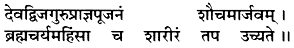 The Supreme Godhead here explains the different kinds of austerity and penance. First He explains the austerities and penances practiced by the body. One should offer, or learn to offer, respect to God or to the demigods, the perfect, qualified brahmanas and the spiritual master and superiors like father, mother or any person who is conversant with Vedic knowledge. These should be given proper respect. One should practice cleansing oneself externally and internally, and he should learn to become simple in behavior. He should not do anything which is not sanctioned by the scriptural injunctions. He should not indulge in sex outside of married life, for sex is sanctioned in the scripture only in marriage, not otherwise. This is called celibacy. These are penances and austerities as far as the body is concerned.