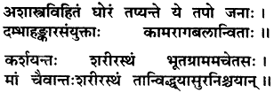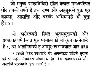 Those who undergo severe austerities and penances not recommended in the scriptures, performing them out of pride, egoism, lust and attachment, who are impelled by passion and who torture their bodily organs as well as the Supersoul dwelling within are to be known as demons.