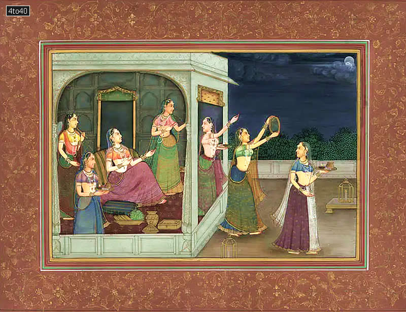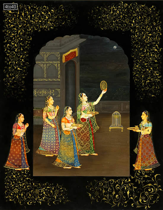 This painting represents the final phase of the Karwa-chauth ritual, a festival of married Hindu women, extremely popular in India