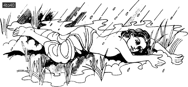 Knowing that he didn’t have much time, he acted fast. He did not stop to think how cold and clammy the wet earth was! The raindrops felt ice cold on his bare body. But he just lay there quietly, in satisfaction that he was finally able to prevent the water from flowing into the fields. Now my Guru’s crops are safe, he said to himself. And that was all that mattered to Aruni. He was now the human wall between the water and the fields!