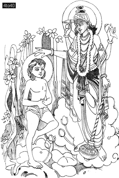 Vishnu was touched by Dhruva’s love and sincerity and appeared before him in all his glory. Suddenly, Dhruva found the whole place full of light and heavy with the fragrance of flowers. Heavenly music played softly. Dhruva opened his eyes to see the wonderful vision of Vishnu standing before him with a smile on his face. His four hands held a conch shell, a chakra, a mace and a lotus.
