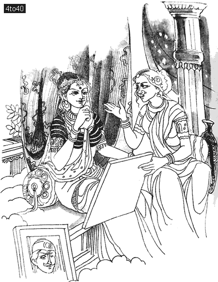 “Please hurry then, I pray to you. Please…,” said Usha, “I shall be eternally grateful to you if you can find him for me.” Chitralekha got busy from the next day, drawing portraits of prince after prince. At night she would take all the portraits and show them to Usha. The princess looked at them eagerly but turned down all of them with a heavy heart. Chitralekha got to work again, drawing and showing them to Usha. One night, Usha picked up the first portrait listlessly. She sat up eagerly and looked at it again. “Who is this?” she asked Chitralekha.
