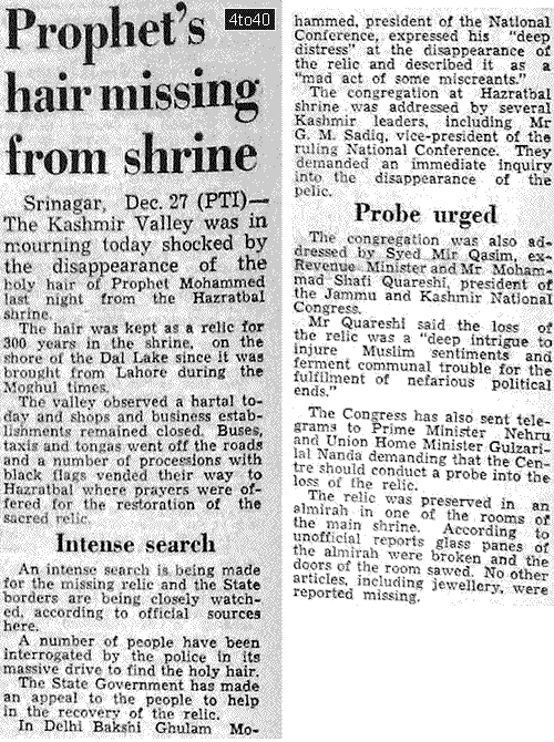 27 दिसंबर, 1963 – कश्मीर में इस दिन एक ऐसी घटना हुई जिसने भारत और पाकिस्तान को हिलाकर रख दिया। वह घटना थी ‘मुए मुकद्दस’ की चोरी। दरअसल ‘मुए मुकद्दस’ पैगंबर साहब की दाढ़ी या सिर के बाल को कहते हैं। मुस्लिमों के बीच ‘मुए-मुकद्दस’ के प्रति काफी श्रद्धा और सम्मान पाया जाता है। ‘मुए मुकद्दस’ की चोरी की खबर पूरे कश्मीर में जंगल की आग की तरह फैल गई। देखते ही देखते कश्मीर सुलगने लगा।