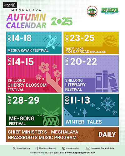 October 2025: Oct 14–18: Megha Kayak Festival Oct 23–25: The 7th Ahor 4×4 Offroad ChallengeNovember 2025: Nov 14–15: Shillong Cherry Blossom Festival Nov 20–22: Shillong Literary Festival Nov 28–29: Me•Gong FestivalDecember 2025: Dec 11–13: Winter Tales Daily Chief Minister’s – Meghalaya Grassroots Music Program |