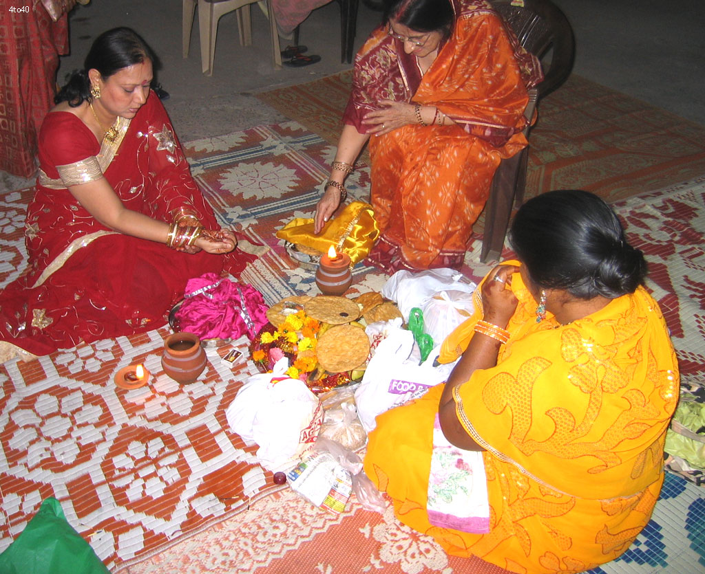 Karwa Chauth RitualsA sudden flurry of activities in the evening indicates that the preparations for the big puja (prayer ceremony) are afoot. The women of the neighborhood usually gather in someone’s house and perform the puja together. A small area is prepared for the ceremony that can be performed in any part of the house as well as in the open. A small square platform is placed against the wall and kharia matti (powdery mud) is used to cleanse, make anew and decorate the puja area. An idol of A sudden flurry of activities in the evening indicates that the preparations for the big puja (prayer ceremony) are afoot.