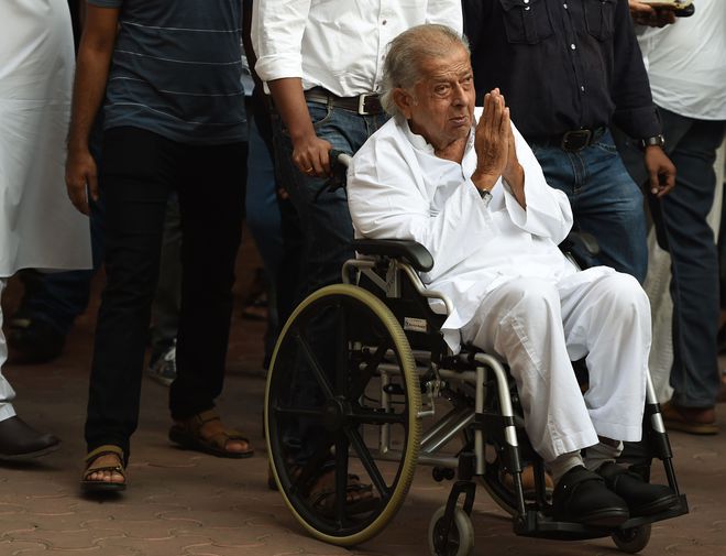Bollywood actor Shashi Kapoor arrives to pay last respects to the deceased Indian actor Om Puri during his funeral in Mumbai on January 6, 2017