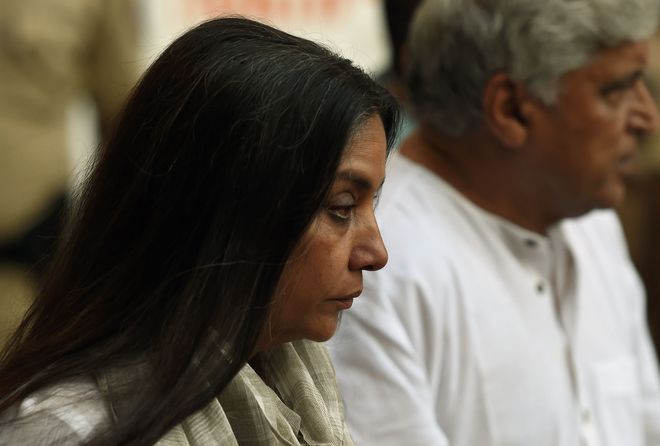 Bollywood actress Shabana Azmi (L) arrives to pay last respects to the deceased Indian actor Om Puri during his funeral in Mumbai on January 6, 2017