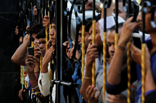 Fans of Bollywood actor Om Puri stand outside his house in Mumbai, India, on January 6, 2017