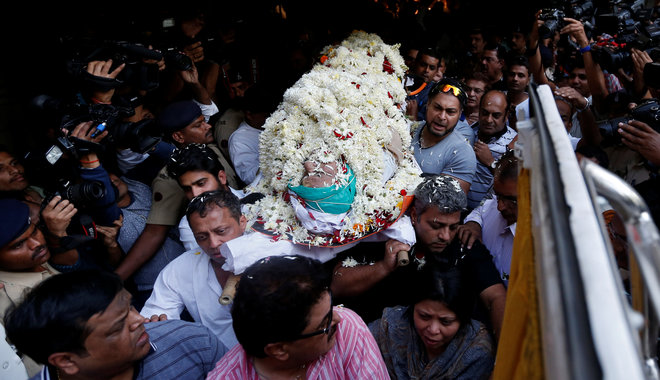 Relatives and friends of Bollywood actor Om Puri carry his body to an ambulance before his funeral in Mumbai, India, on January 6, 2017