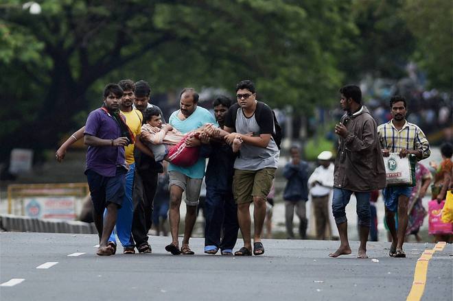 A man is rescued from his house in the flooded Kotturpuram area in Chennai on December 2, 2015.