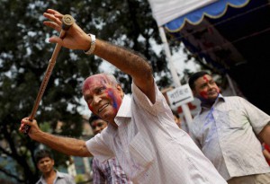 DHAKA: An elderly Bangladeshi Hindu devotee dances in front of a Hindu temple on the last day of Durga Puja festival in Dhaka, Bangladesh, Friday, Oct. 23, 2015. The festival commemorates the slaying of a demon king by lion-riding, ten-armed goddess Durga, marking the triumph of good over evil. AP/PTI(AP10_23_2015_000123A)
