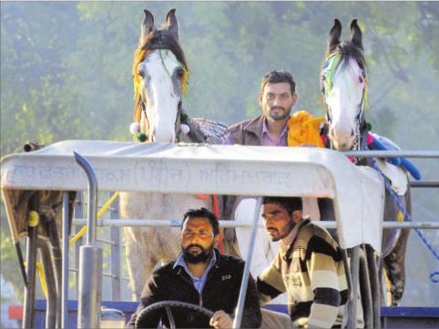 A man rides on two horses on second day as they take part in the 80th MRF Kila Raipur Sports Festival in Kilaraipur on the outskirts of Ludhiana on February 5, 2016.