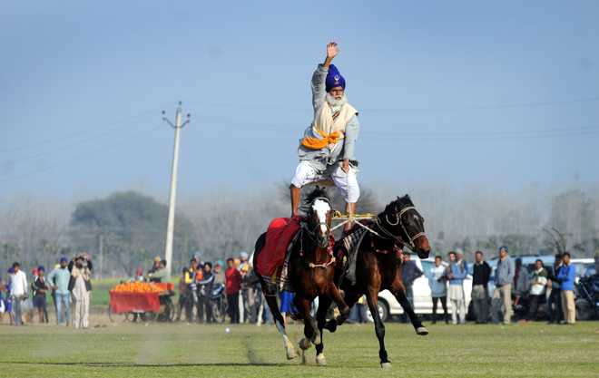 A Nihang balance on two horses on second day as they take part in the 80th MRF Kila Raipur Sports Festival in Kilaraipur on the outskirts of Ludhiana on February 5, 2016.