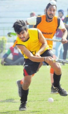 A players hits the ball during a hockey match