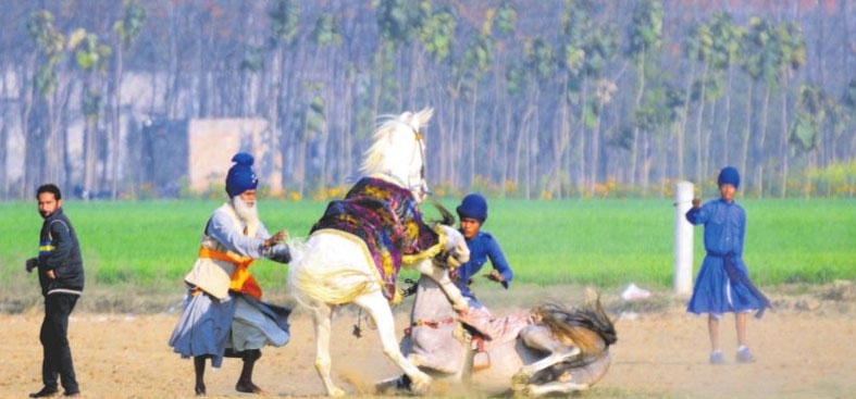 Nihangs try to control their horses on the second day of the 80th Kila Raipur Sports Festival Ludhiana