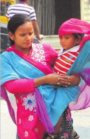 On the eve of Mother’s Day a woman wraps her child with a chunni to protect him from the scorching heat in Amritsar