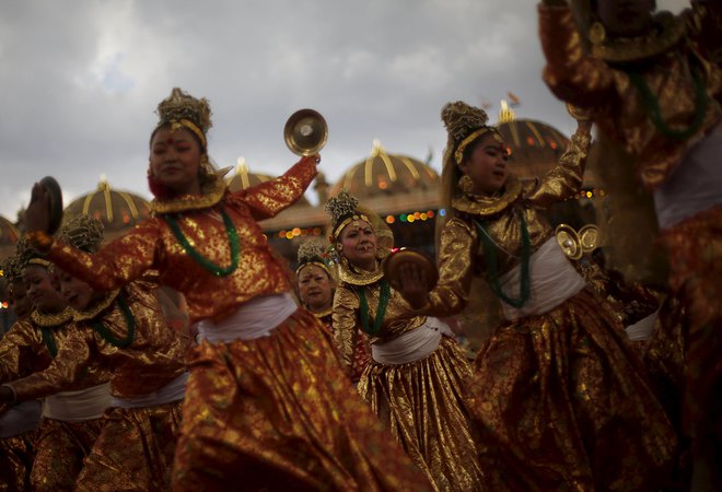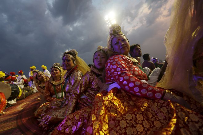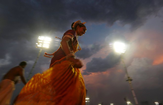 Participants perform a dance during the World Culture Festival on the banks of the river Yamuna in New Delhi on March 12, 2016