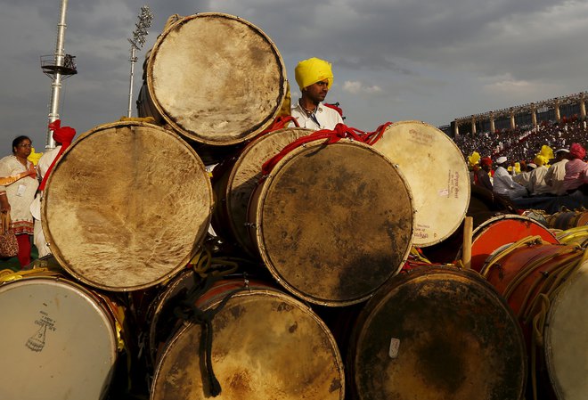 A participant stands next to drums as he watches others performing dance during the World Culture Festival on the banks of the river Yamuna in New Delhi on March 12 2016