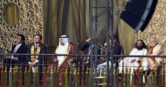 Prime Minister Narendra Modi with Art of Living founder Sri Sri Ravishankar on the inaugural day of the World Culture Festival