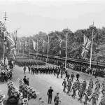 Canadian Army and Royal Canadian Navy detachments approach the reviewing stand during the Victory Parade in London, England June 8, 1945