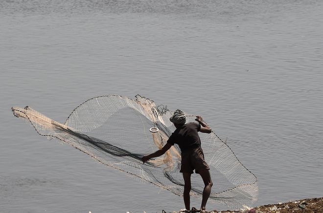 A Pakistani fisherman uses a net to try to catch fish on a riverbank in Lahore