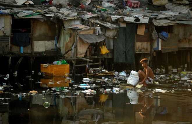 A man on a makeshift raft searches for discarded plastic bottles over a polluted river in Manila