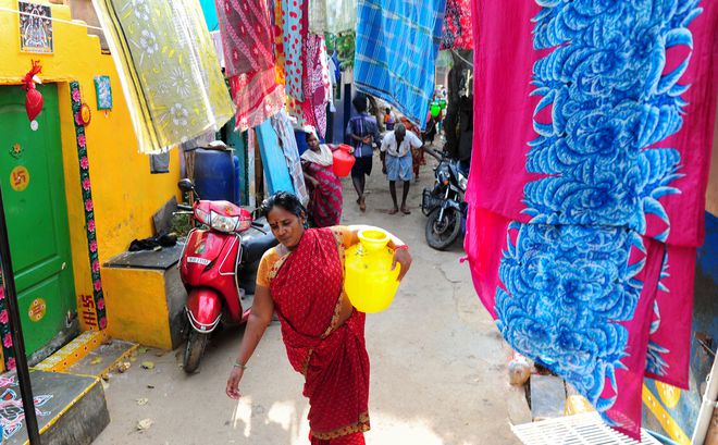 An Indian woman carries a pot containing drinking water at a residential area in Chennai