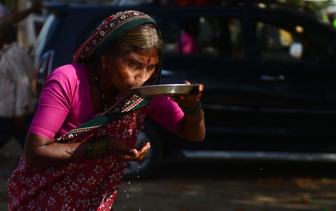 An Indian woman drinks water by a plate in Allahabad