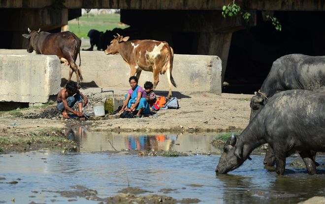 An Indian woman washes clothes by a water tap as animals gather around a polluted pond in Allahabad