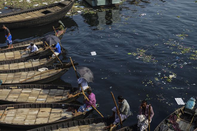 Bangladeshi boatmen wait for commuters next to the polluted water of the Burignaga river in Dhaka