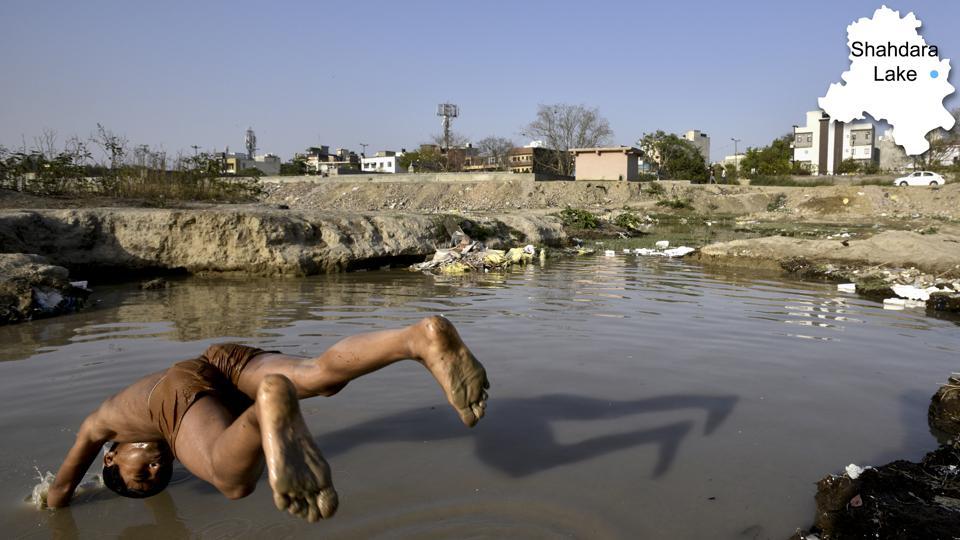 A child jumps in to the Shahdara lake, which has been turned into a garbage dump over the years, in East Delhi. Data available with the Delhi government says there are over 1,000 water bodies in the capital but due to encroachment and urbanisation, nearly 80% just exist on paper, say activists
