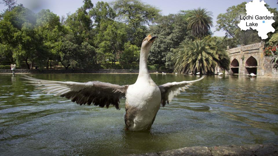 A duck flutters inside the Lodhi Garden lake. Despite judicial orders, we see no progress,” activist Diwan Singh, who is part of the Dwarka Water Bodies Committee, said
