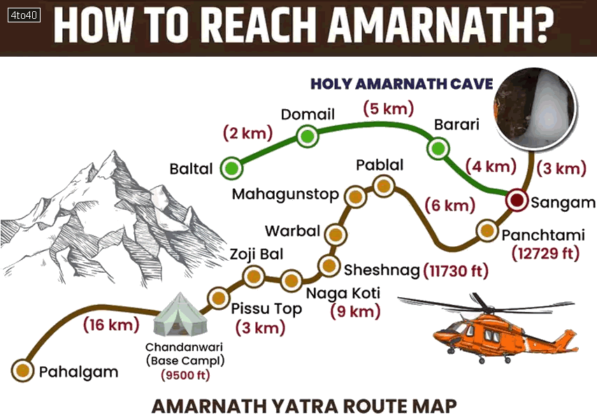 There are two routes to the Amarnath Cave, one is the traditional 48-km-long Nunwan-Pahalgam route in Anantnag district, and the other is the 14-km shorter but steeper Baltal route in Ganderbal district.